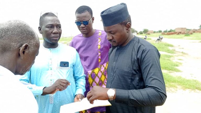 Accompagné des techniciens du cadastre, le Délégué Provincial de la Jeunesse et des Sports,...